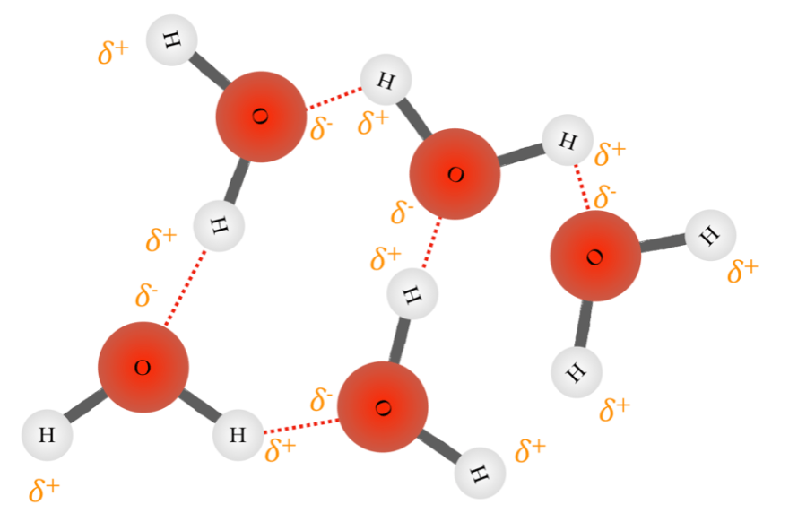 As I mentioned before, a common case study is that of water. H2O, H-O-H – from its structure alone it is clear that hydrogen bonding must be present.